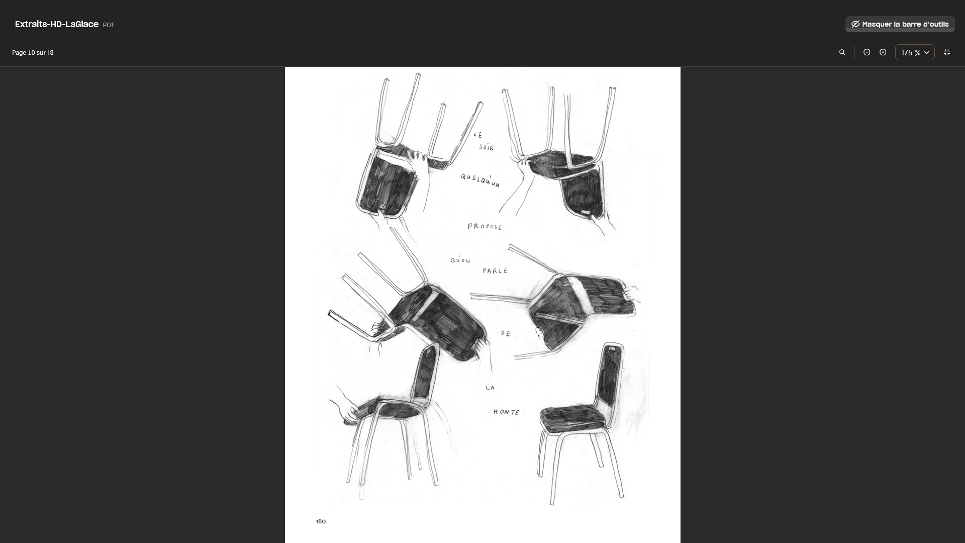 Alors qu’elle était en résidence en Fédération Wallonie Bruxelles, Charlotte est passée par Liège et nous a discrètement offert son premier livre, l’incandescent Je prends feu trop souvent, publié aux éditions Station T en 2022. Cet ouvrage puissant, très travaillé, aborde les souffrances psychiques d’une jeune fille et parle « d’une recherche d’équilibre entre la violence et la douceur, la colocation et la solitude, la fuite et l’acceptation. » Avec le crayon gris cherchant un équilibre entre les hachures, les traits et les interstices, l’usage incroyablement poussé de la gomme, quelques touches de craie grasse oranges et jaunes, toujours justes, ou encore de la gouache très liquide grise et noire, ses dessins nous plongent avec force dans les ressentis psychosomatiques de la narratrice. La grande maitrise des points de vue, des cadrages et de la mise en page permettent à l’album de figurer sans fard et sans spectacularisation des états de corps multiples et hors normes. Son texte manuscrit à la craie grasse, traces du "ce qui se dit" tout comme du "comment c’est dit" - on pense à Cy Twombly, tient sans relâche les yeux grands ouverts sur ce qui se passe devant et derrière la rétine.